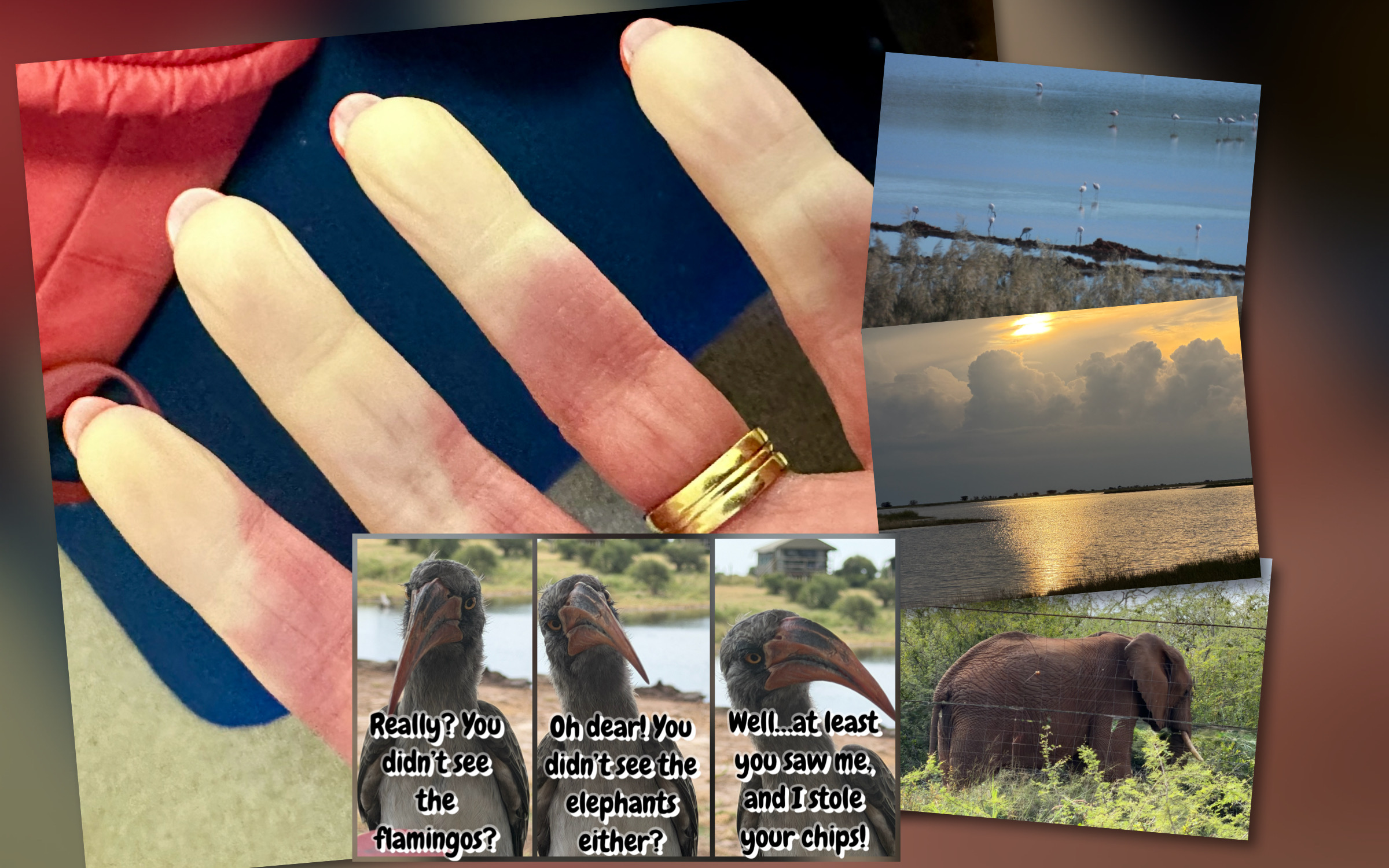 On Saturday we drove to Elephant Sands, hoping to see some elephants up close and personal. We sat down to enjoy lunch on a terrace adjacent to a large watering hole. The accommodation around the watering hole reminded me of a scene from The Crown, where a newlywed princess Elizabeth and prince Phillip stayed in similar accommodation in Botswana. After lunch a few cheeky hornbills cozied up to me and allowed me to snap a few pics of them. The cheekiest two had bills the colour of what I can only accurately describe as pinkish vomit — that very colour of that which is expelled from the mouth of a two-year-old who has eaten way too much strawberry yogurt and pink zoo cookies. The pink-vomit-billed hornbills ventured right onto the table and, after posing for a satisfactory number of up close iPhone snapshots, they snatched up some of my leftover chips and flew away. Although the hornbills certainly provided unexpected entertainment (bottom pic), not a single elephant visited the watering hole and we left there without catching a glimpse of even a single elephant.